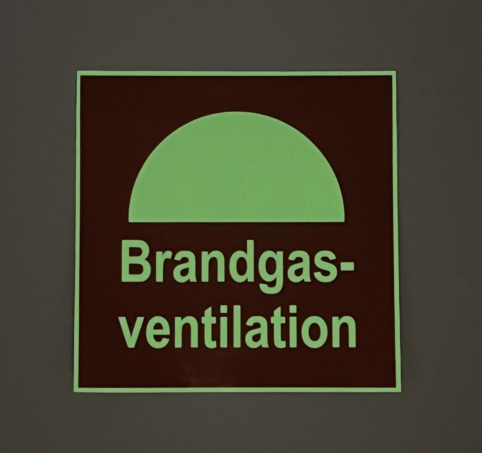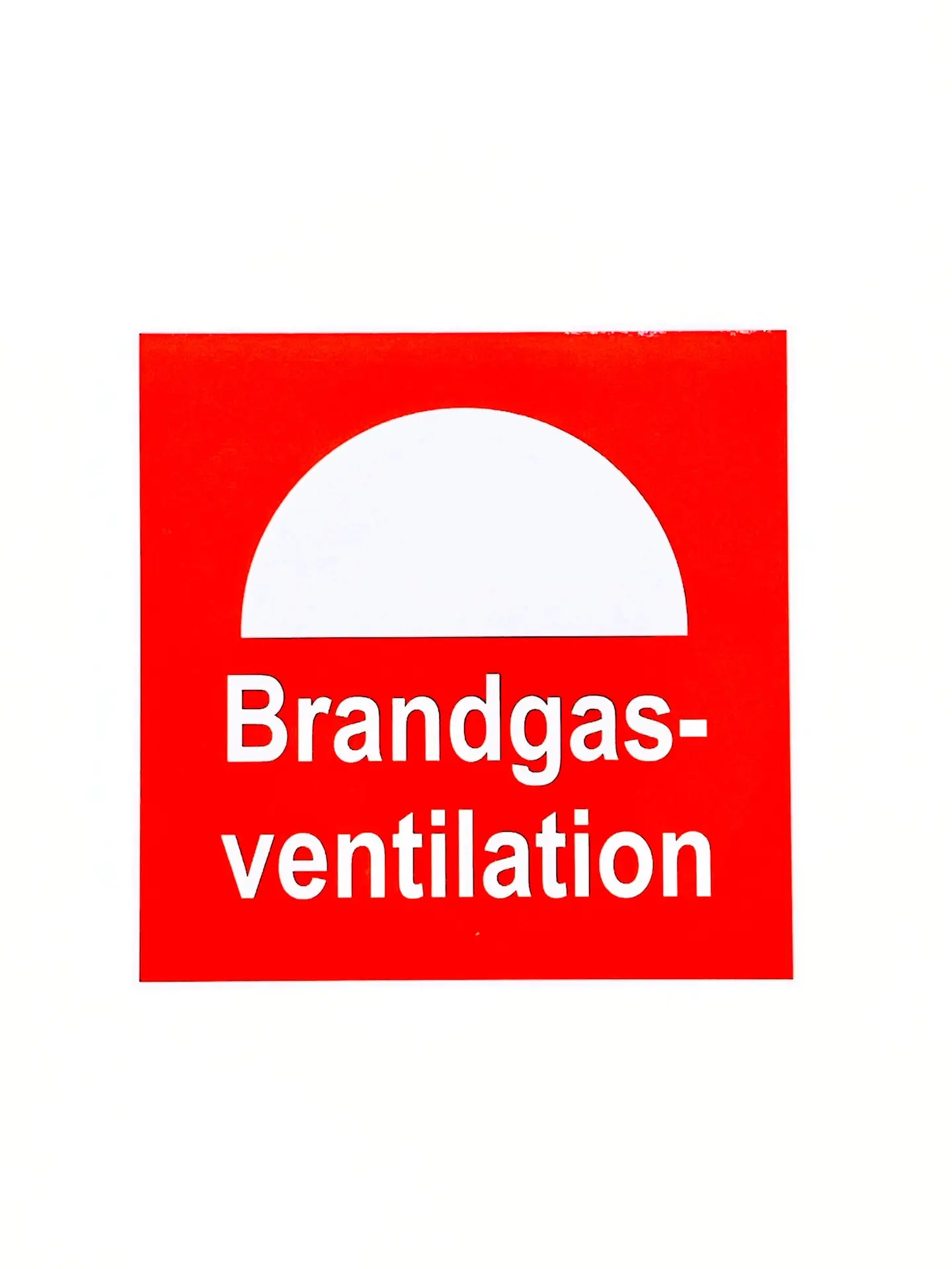 Skylt i storleken 150*150mm med text Brandgasventilation med brandsymbol enligt myndighetskraven i standarden AFS 2008:13.