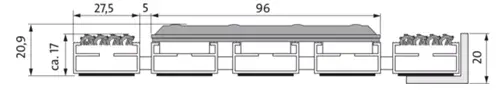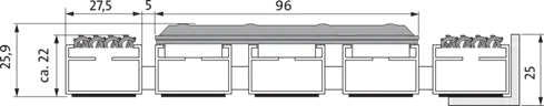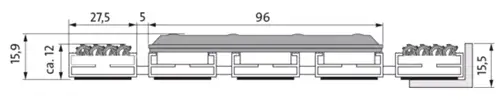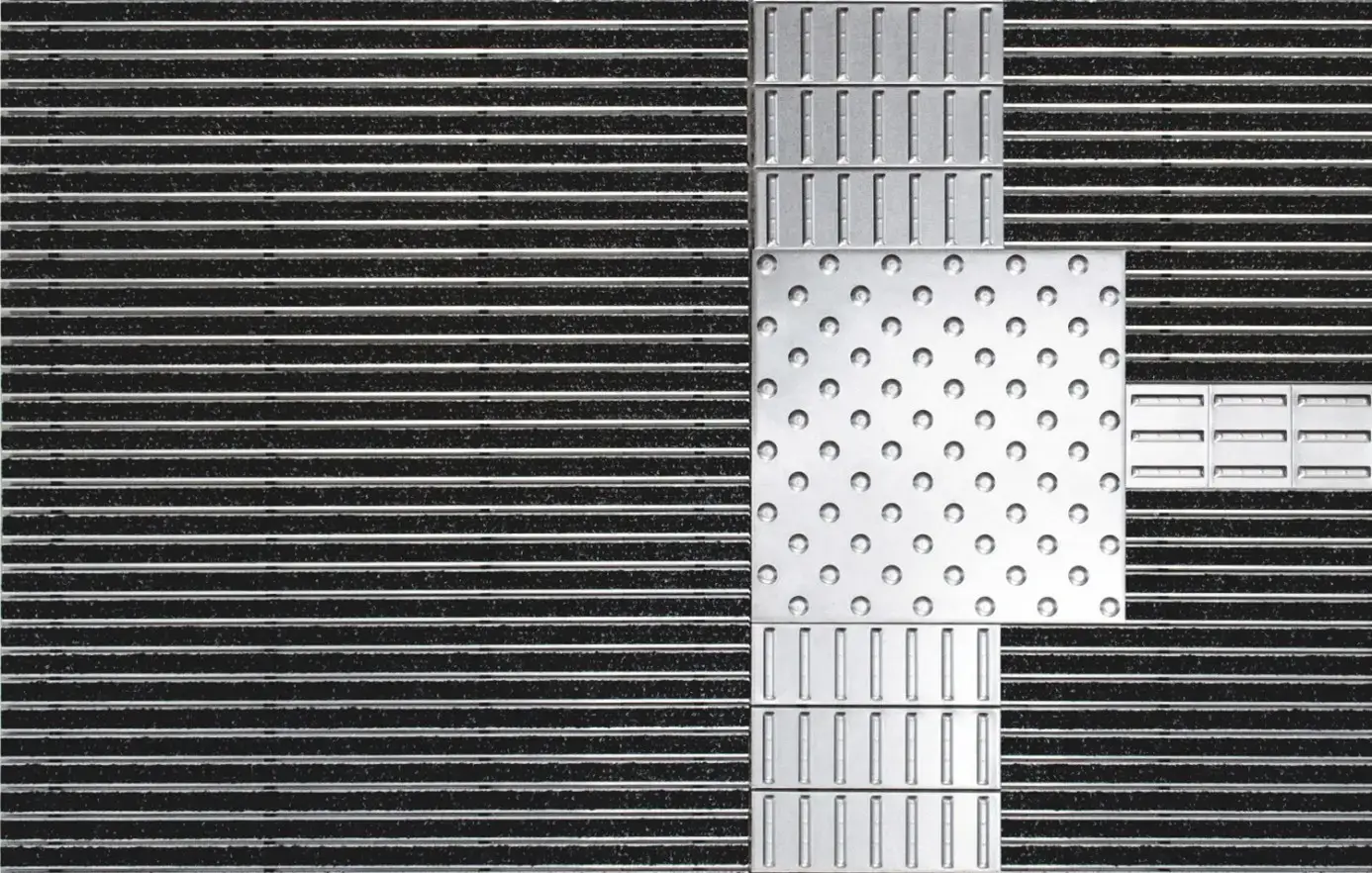 Upp rullbar, slitstark entrématta för montering. Utrustad med plattor av rostfritt stål i smal (122 mm) eller bred (300 mm) version för taktil vägvisning. Varje sektion innehåller 3 aluminiumprofiler. Exakt tillverkad i bredden. På djupet är ritmått i 100 mm-steg möjliga. Eventuellt med en knoppad aluminiumsektion som uppmärksamhetsfält.
