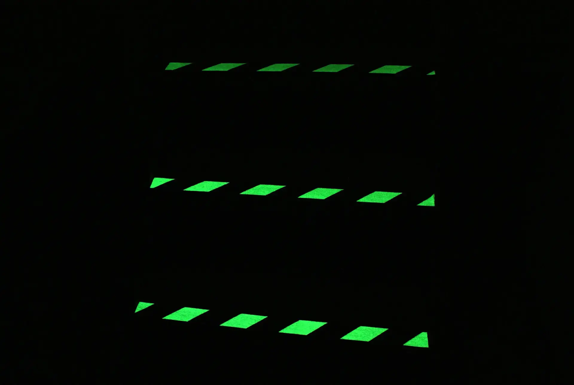 Efterlysande halkskyddstejp med högt halkskydd och högkvalitativt adhesiv och dessutom dubbla lager av efterlysande material för att säkerställa den efterlysande effekten när strömmen går. Under dagtid har tejpen en ljus grön nyans varvat med svart vilket gör att den syns mycket bra även i ljus och i mörker avger den en starkt vitt ljus varvat med svart. Tejpen kan laddas antingen med naturliga eller artificiella ljuskällor. Ljusemissionens varaktighet varierar beroende på mängden ljus som tas emot och släpps successivt efter några timmar.