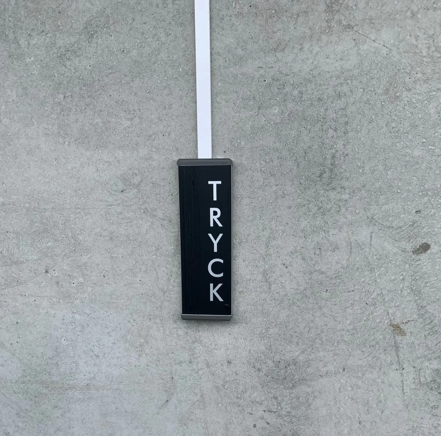 Kontrastmarkering i folie för armbågskontakter med utskuren text “TRYCK”.