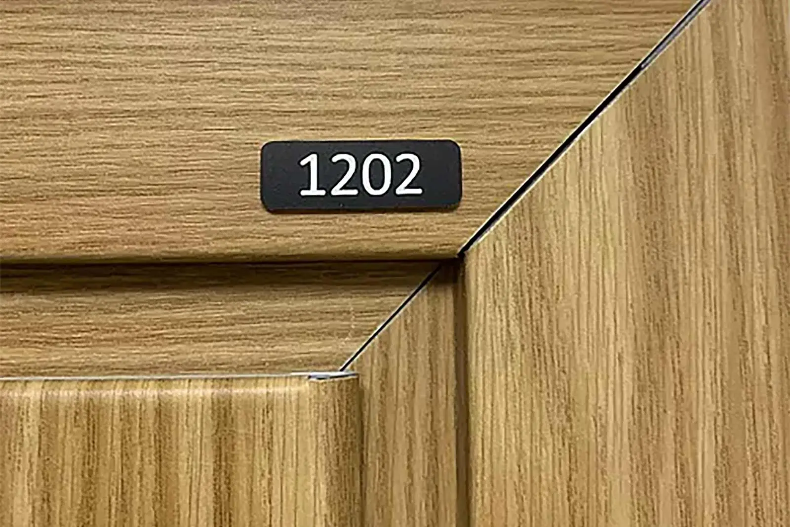 Graverade rumsnummer skyltar med lim på baksidan eller skruvhål och lim om så önskas.