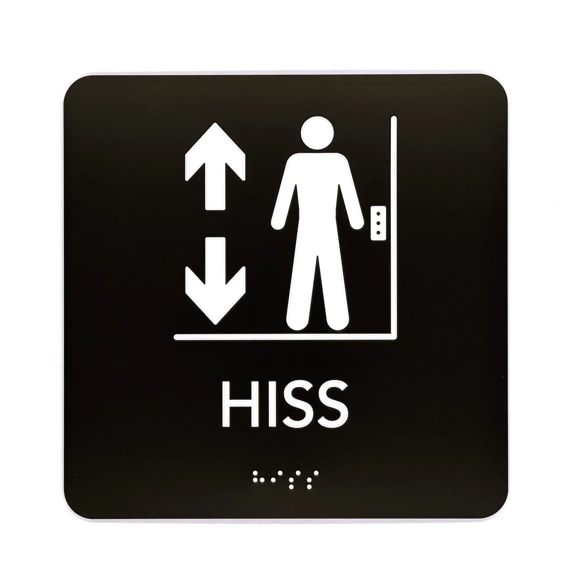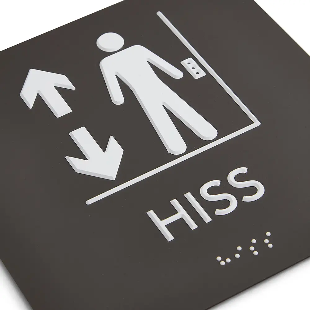 Skylten består av en mörkgrå botten av akryl samt vit text och symbol i relief (upphöjda bokstäver) och vit punktskrift (braille). Kommer med förmonterad skumtejp för ett smidigt montage.