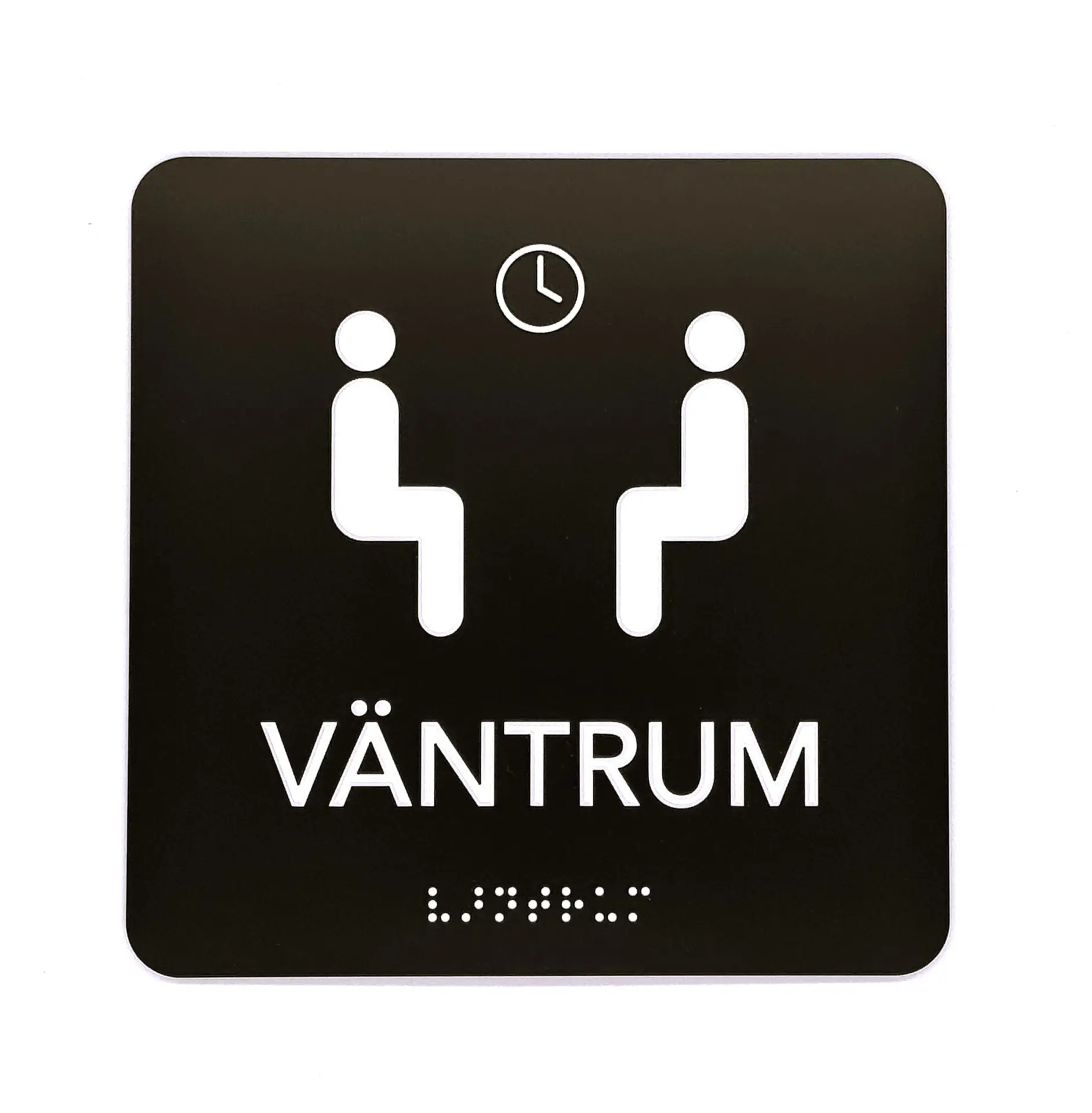 Skylten består av en mörkgrå botten av akryl samt vit text och symbol i relief (upphöjda bokstäver) och vit punktskrift (braille). Kommer med förmonterad skumtejp för ett smidigt montage.