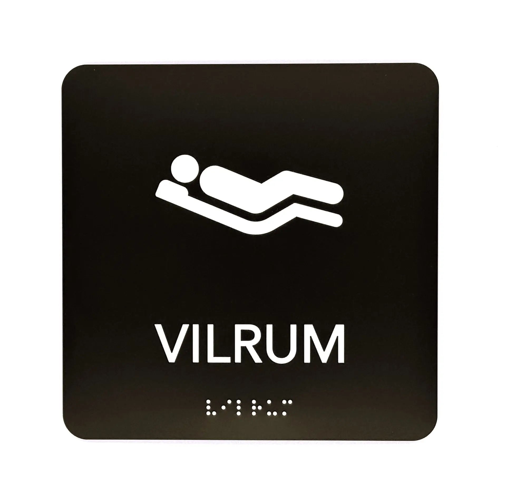 Skylten består av en mörkgrå botten av akryl samt vit text och symbol i relief (upphöjda bokstäver) och vit punktskrift (braille). Kommer med förmonterad skumtejp för ett smidigt montage.
