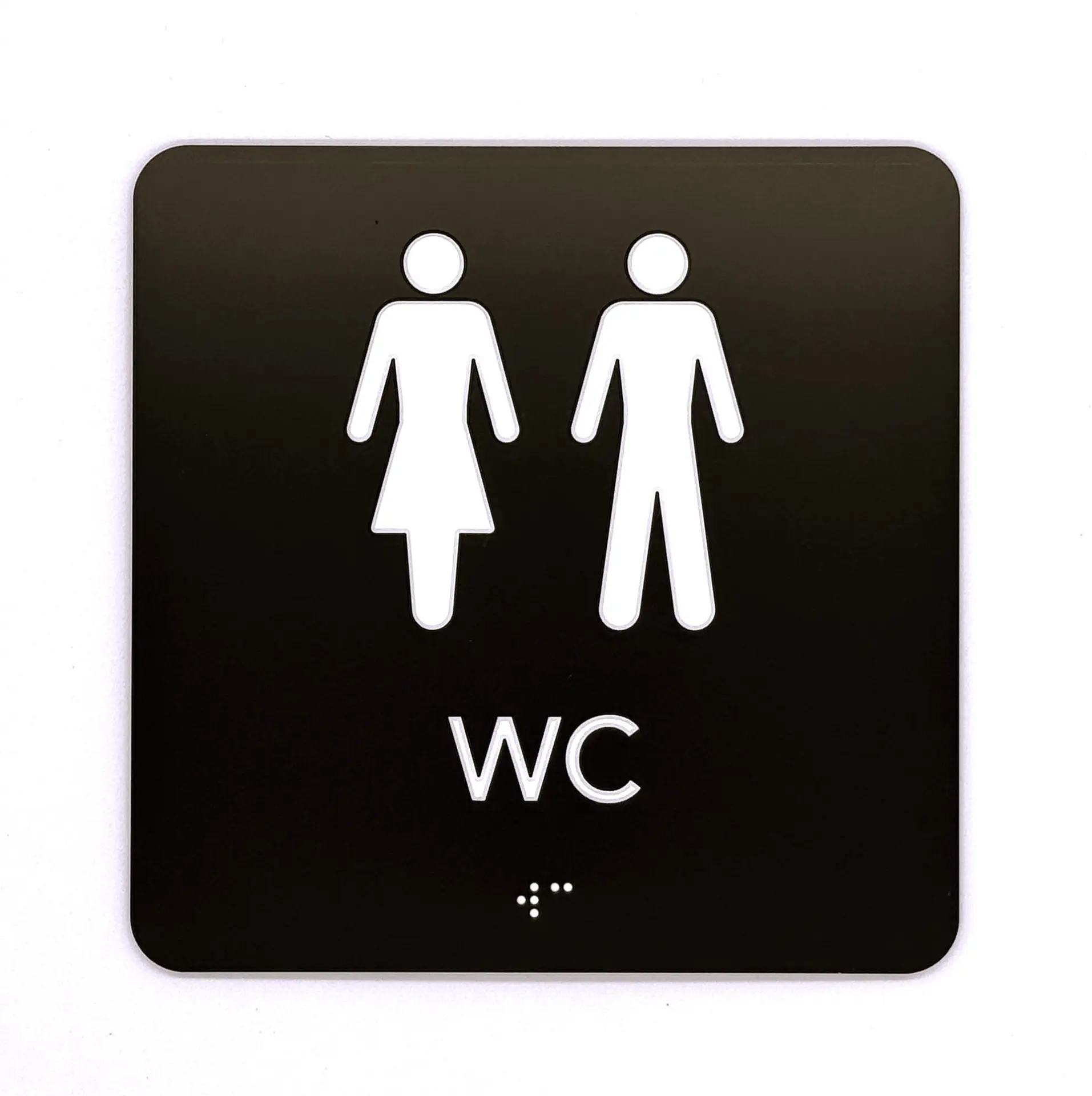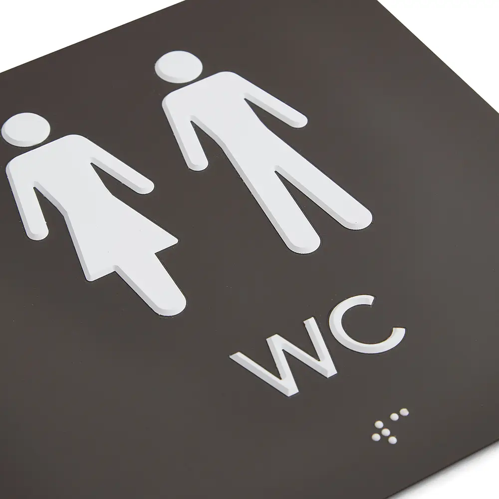 Skylten består av en mörkgrå botten av akryl samt vit text och symbol i relief (upphöjda bokstäver) och vit punktskrift (braille). Kommer med förmonterad skumtejp för ett smidigt montage.