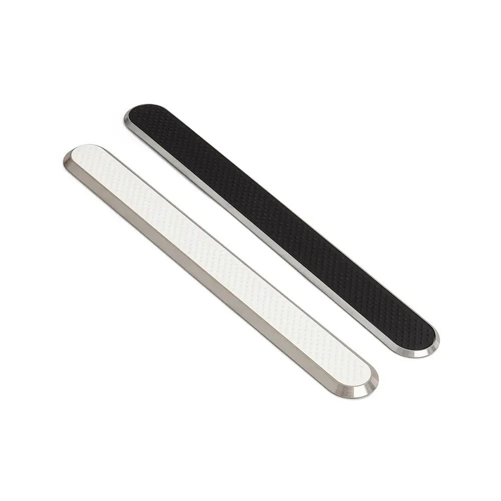 Taktila ledstavar i rostfritt stål med svart eller vitt ilägg av TPU. Produkten monteras med mall och ska vid montage utsättas för tryck på väl rengjord yta.